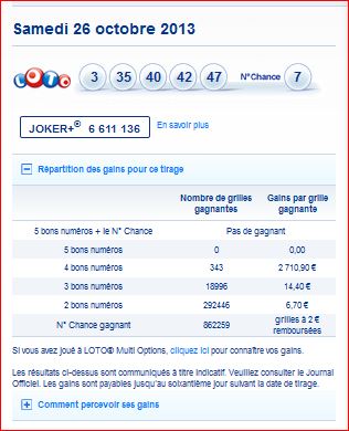 Tirage loto samedi 26 octobre 2013,numéros gagnants et tableau des gains (rapport)