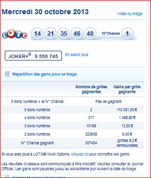 Tirage loto mercredi 30 octobre 30/10/2013,numéros gagnants et tableau des gains