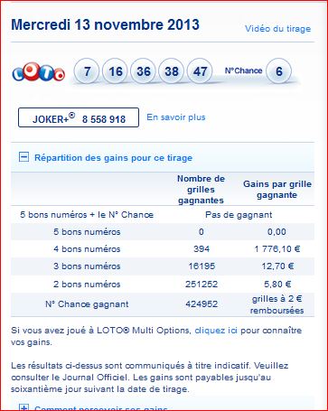 Rapport et répartition des gains de ce Loto du mercredi 13 novembre 13/11