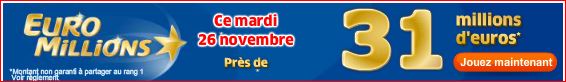 Pour le tirage du prochain euro millions du mardi 26 novembre 26/11 une cagnotte de 31 millions € est en jeu !