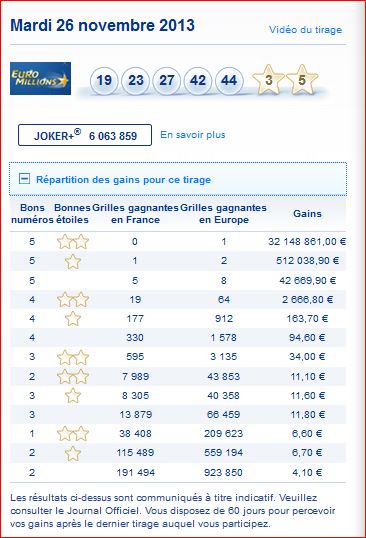 Résultat Tirage Euro Millions du Mardi 26 novembre 26 /11/2013