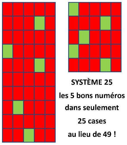 - On choisi les 5 numéros à jouer parmi 25 numéros (le système) au lieu des 49 ou 50 d’un bulletin normal. Voir le schéma ci-dessous