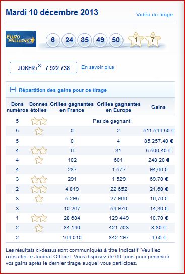 Rapport et gains de ce tirage Euro millions du Mardi 10 décembre 10/12/2013