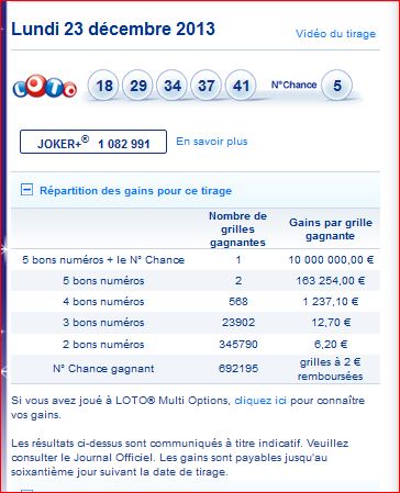 Tirage Loto du lundi Lundi 23 décembre 23/12/2013 « Jackpot 10 millions minimum »
