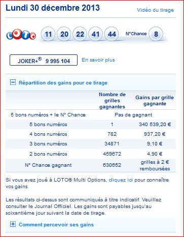 Les résultats de ce tirage du loto du 30 / 12 sont les numéros gagnants