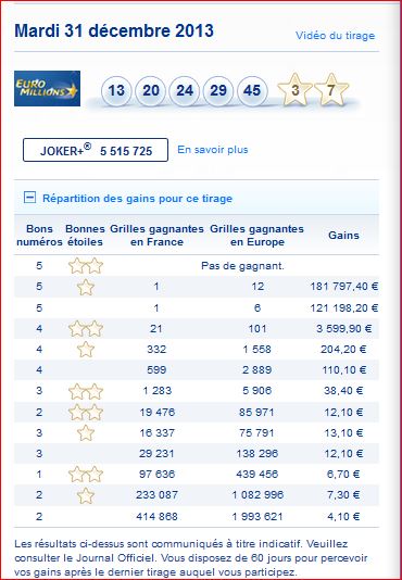 Rapport et gains de ce tirage Euro millions du Mardi 31 décembre 31/12/2013