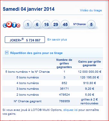 Les résultats de ce tirage du loto du 4 / 01 sont les numéros gagnants
