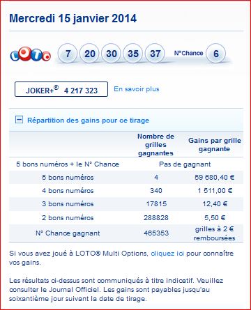 Tirage Loto du Mercredi 15 janvier 2014