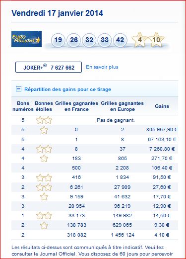 Tableau des gains par rang et du nombre de gagnants de ce tirage Euro millions du Vendredi 17 janvier 2014
