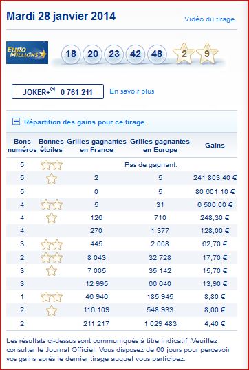 Résultat Tirage Euro Millions du Mardi 28 janvier 28/1/2014
