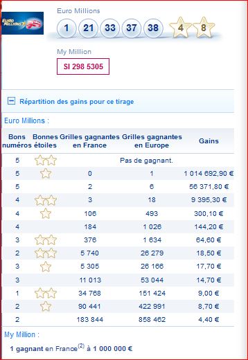 Tableau des gains par rang et du nombre de gagnants de ce tirage Euro millions du mardi 4 février 2014