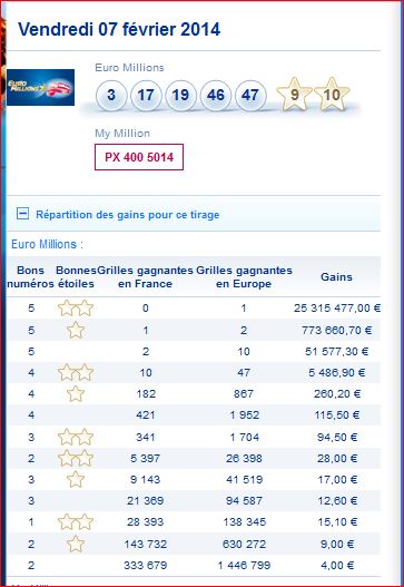 Tableau des gains par rang et du nombre de gagnants de ce tirage Euro millions du Vendredi 7 février 2014