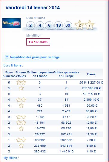 Tableau des gains par rang et du nombre de gagnants de ce tirage Euro millions du Vendredi 14 février 2014