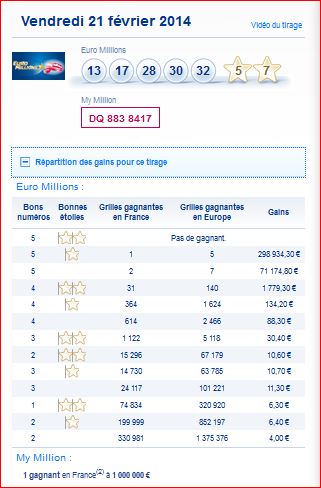 Tableau des gains par rang et du nombre de gagnants de ce tirage Euro millions du Vendredi 21 février 2014