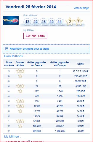 Tableau des gains par rang et du nombre de gagnants de ce tirage Euro millions du Vendredi 28 février 2014