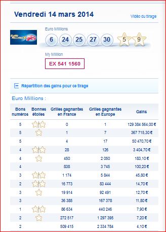 Tableau des gains par rang et du nombre de gagnants de ce tirage Euro millions du Vendredi 14 mars 14/03