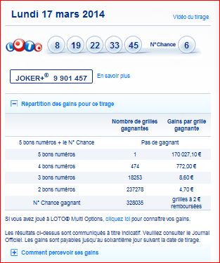 Loto tirage du Lundi 17 Mars 2014