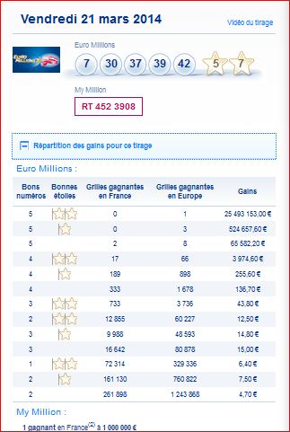 Tableau des gains par rang et du nombre de gagnants de ce tirage Euro millions du Vendredi 21 mars 21/03 numero gagnant MY MILLION