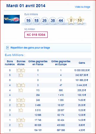 Tableau des gains par rang et du nombre de gagnants de ce tirage Euro millions du mardi 1 Avril 1/04