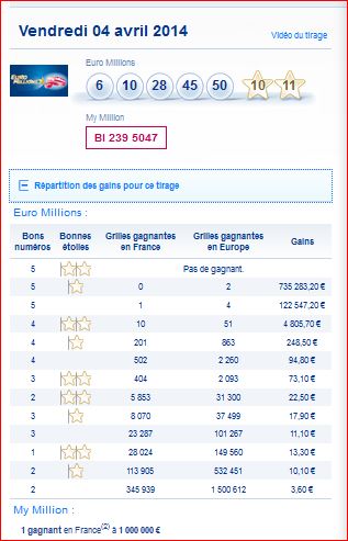 Tableau des gains par rang et du nombre de gagnants de ce tirage Euro millions My million du Vendredi 4 Avril 4/04