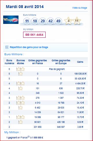 Tableau des gains par rang et du nombre de gagnants de ce tirage Euro millions du mardi 8 Avril 8/04