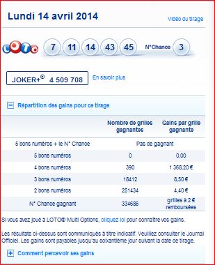 Loto tirage du Lundi 14 Avril 2014
