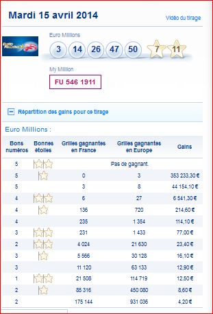 Tableau des gains par rang et du nombre de gagnants de ce tirage Euro millions du mardi 15 Avril