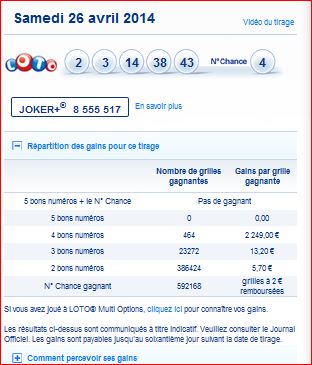 Les résultats de ce tirage du loto du 26/04 sont les numéros gagnants