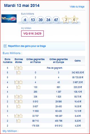 Tableau des gains par rang et du nombre de gagnants de ce tirage Euro millions du mardi 13 mai 13/05