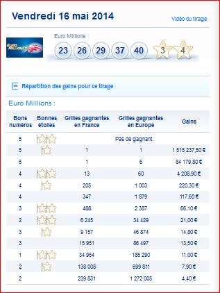 Tableau des gains par rang et du nombre de gagnants de ce tirage Euro millions My million du Vendredi 16 mai