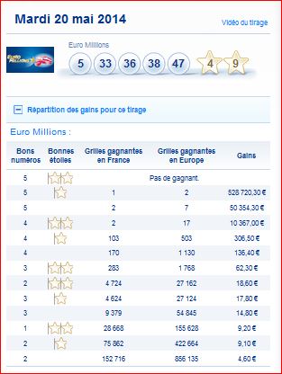 Tableau des gains par rang et nombre de gagnants du tirage Euro millions du mardi 20 mai