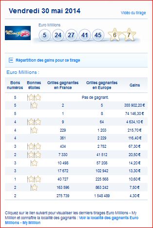 Tableau des gains par rang et du nombre de gagnants de ce tirage Euro millions My million du Vendredi 30 mai