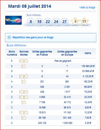 Tableau des gains par rang et nombre de gagnants du tirage Euro millions du mardi 8 juillet