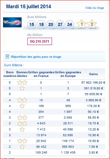 Tableau des gains par rang et nombre de gagnants du tirage Euro millions du mardi 15 juillet