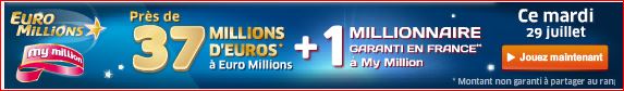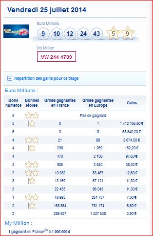 Tableau des gains par rang et du nombre de gagnants de ce tirage Euro millions My million du Vendredi 25 juillet