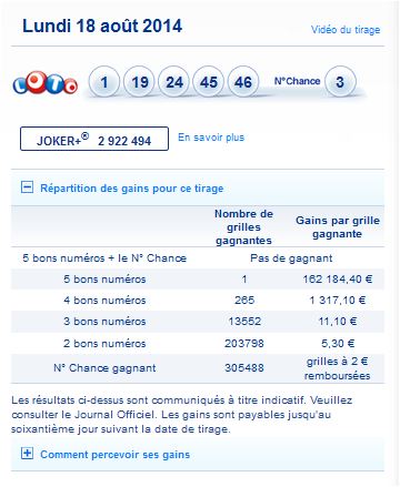 Loto tirage du Lundi 18 août 2014