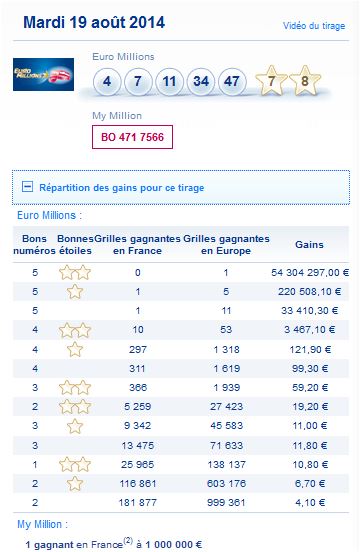 Euromillions-My Million-mardi 19 Août 19/08-Résultat du tirage