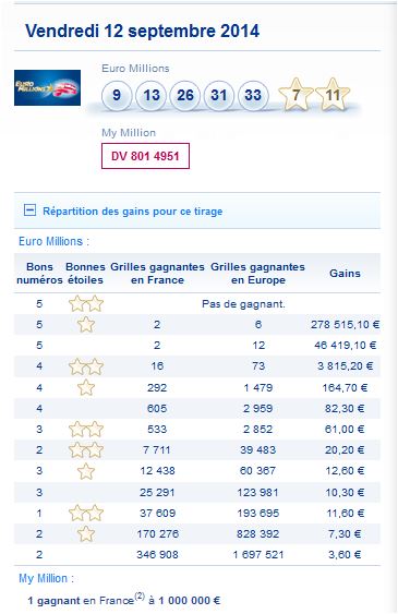 Tableau des gains par rang et du nombre de gagnants de ce tirage Euro millions My million du Vendredi