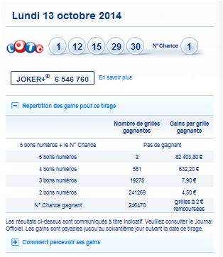 LOTO-résultat du tirage du Lundi 13 octobre 2014