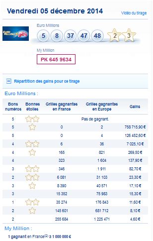 euromillion-my million – résultat et rapport du tirage et numéros gagnants.