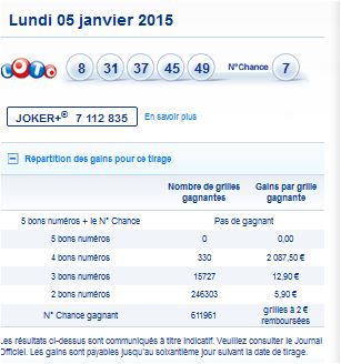 LOTO-résultat du tirage du Lundi 5 janvier 2015