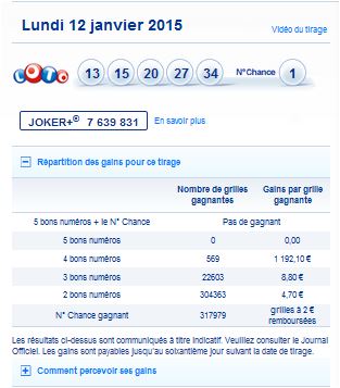 LOTO-résultat du tirage du Lundi 12 janvier 2015
