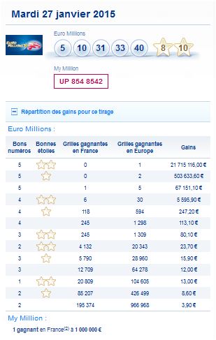 Résultat Tirage Euro Millions du mardi 27 janvier 2015