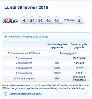 LOTO-résultat du tirage du Lundi 9 février 2015