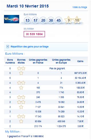 Résultat Tirage Euro Millions du mardi 10 février 2015