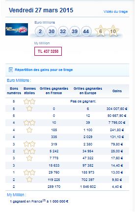 Euromillions My Million Vendredi 27 mars 2015 Résultat Tirage