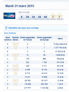 Résultat Tirage Euro Millions du mardi 31 mars 2015