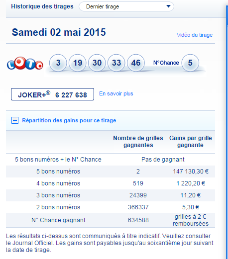 Seuls les résultats des tirages publiés au Journal Officiel font foi.