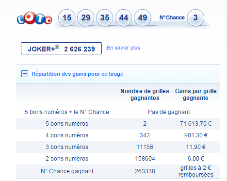 Tirage loto,numéros gagnants et tableau des gains (rapport)