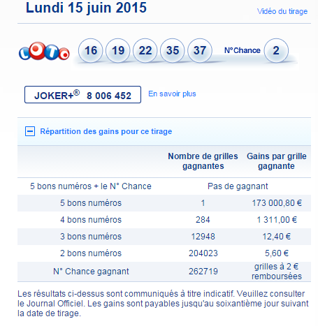 Seuls les résultats des tirages publiés au Journal Officiel font foi.
